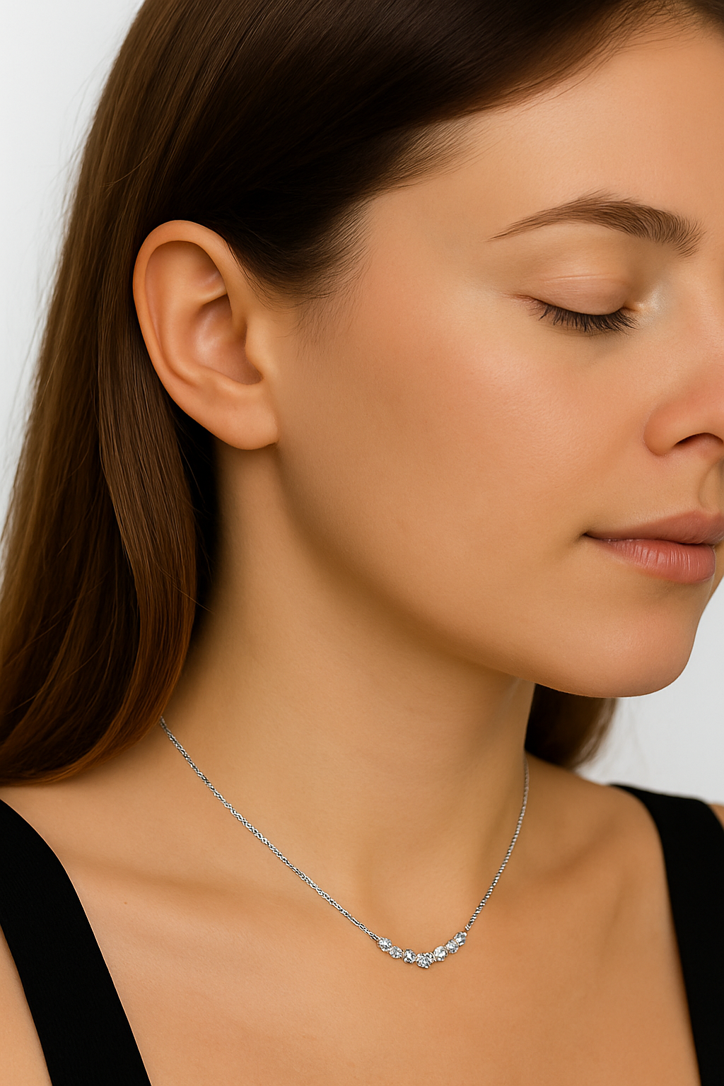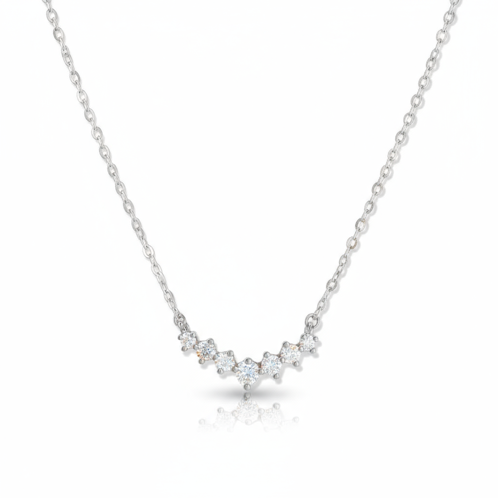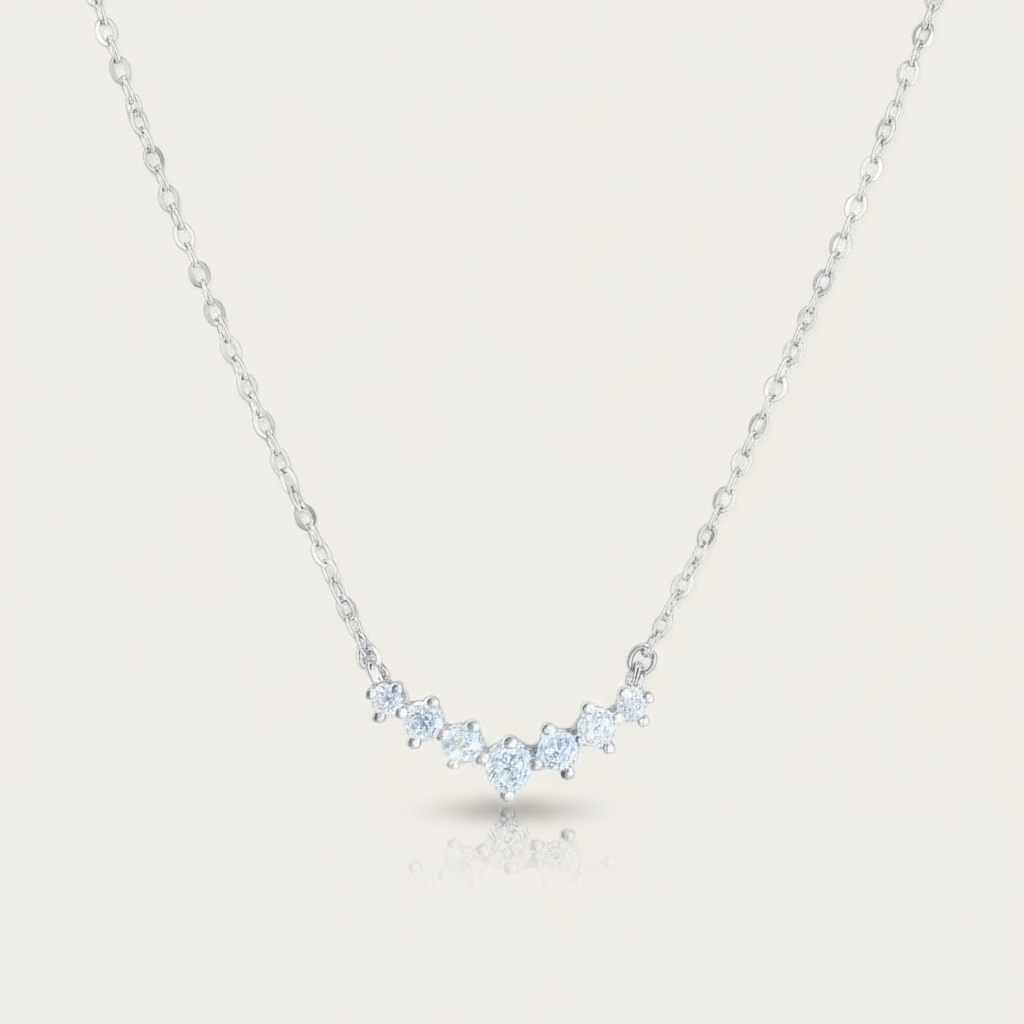 Fin et lumineux, Céleste souligne la clavicule d’un éclat délicat. Son pendentif incurvé, serti de zircons cubiques de haute qualité, offre une brillance nette et raffinée — un essentiel du luxe léger, au quotidien comme en soirée.